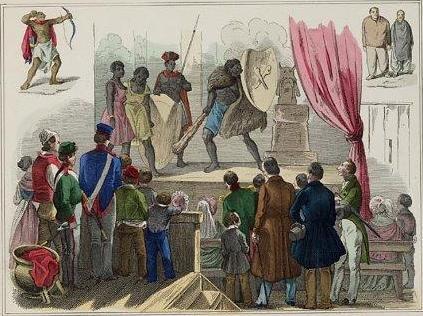 'Wilden op de kermis', uit: H. Ilpzema Vinckers, Wat is er op de kermis te zien? Jaar van verschijning:1848, dus kort voor de afschaffing van de slavernij. Hoewel de schrijver medelijden toont met de 'wilden' die 'als dieren' werden getoond, geeft zijn commentaar toch te denken: 'Gij, die met ons armen spot, Hoe vergeet gij dan dat God, Die de gansche wereld schiep, Ons, ook ons in 't aanzijn riep?' www.geheugenvannederland.nl